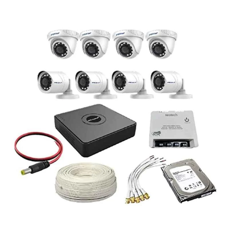 Introducing the Prama 2MP CCTV Surveillance System, a comprehensive security solution that combines cutting-edge technology with reliability to safeguard your property. This bundle includes 4 high-resolution Bullet and 4 Dome cameras, ensuring complete coverage of your surroundings. Equipped with 2MP resolution, these cameras deliver crisp and clear video footage, enabling you to monitor every detail with precision. The 8-channel DVR (Digital Video Recorder) provides a centralized hub for seamless recording and playback, and with the included 1TB Hard Disk, ample storage space is available for extended video retention.
